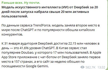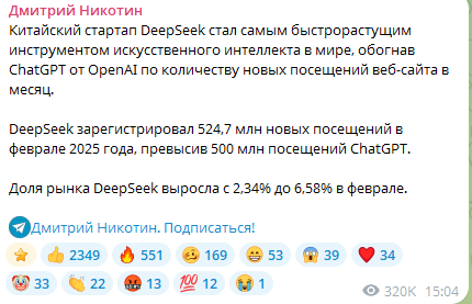 Стартап DeepSeek R1 стал самым быстрорастущим инструментом искусственного интеллекта в мире, обогнав ChatGPT от OpenAI по количеству новых посещений веб-сайта в месяц: в феврале на ресурсы DeepSeek перешли 524,7 млн новых посетителей, тогда как за ChatGPT закрепились 500 млн посещений.