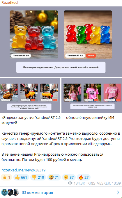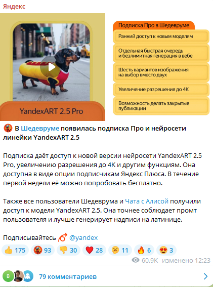 Базовая версия YandexART 2.5 бесплатна, а самая мощная единица в линейке YandexART 2.5 Pro доступна владельцам новой подписки «Про». Оформить её могут подписчики «Яндекс Плюс».
