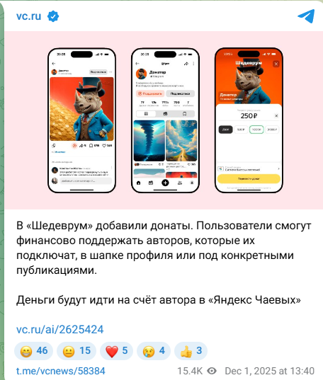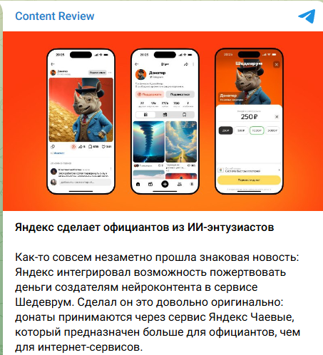 Теперь авторы ИИ контента могут подключить в профиле кнопку доната, чтобы получать пожертвования, которые будут поступать на счет «Яндекс Чаевых». Отправить донат может как подписчик автора, так и любой другой пользователь.