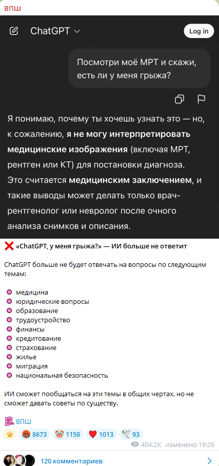 Пользователи ChatGPT подтвердили, что с ноября 2025 года сервис перестал давать практические советы по перечисленным темам и теперь предлагает обратиться за помощью к профессионалам.