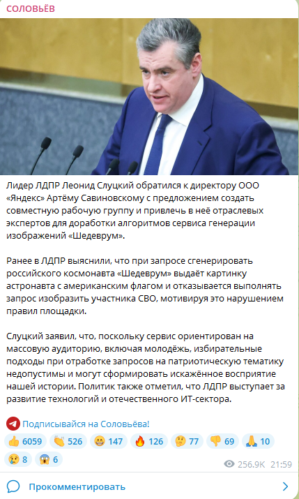 Одной из популярных новостей 2025 года о «Шедевруме» стало предложение председателя партии ЛДПР Леонида Слуцкого перенастроить алгоритмы нейросети для генерации изображений и видео.