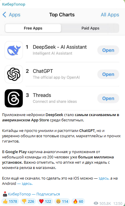1. DeepSeek поднялся на вершину рейтинга AppStore в США с новой нейросетью R1