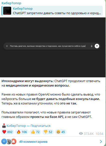 Руководство OpenAI представило новую политику ChatGPT, согласно которой впредь чат-бот больше не будет предоставлять консультации по юридическим и медицинским вопросам, а также по миграции, национальной безопасности, финансам, кредитованию, трудоустройству и ряду других сложных тематик.