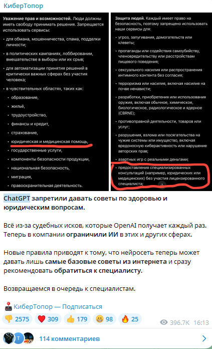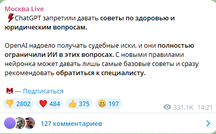 3. ChatGPT перестал давать советы по здоровью и юридическим вопросам и отправляет пользователей к специалистам
