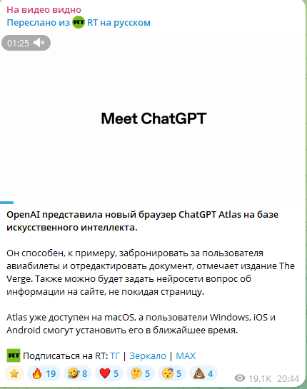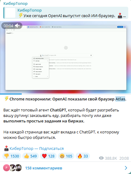 Ещё одной громкой новостью OpenAI стал запуск браузера Atlas со встроенными функциями ChatGPT. Пользователи Atlas могут сёрфить в сети с помощью нейропомощника, управлять памятью поиска с помощью ИИ и включить режим агента, делегировать ChatGPT определённые задания — скачать документ, оформить онлайн-заказ, ответить на сообщение в почте и т.д.