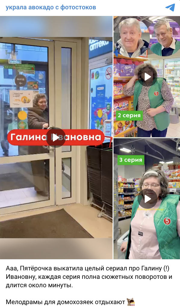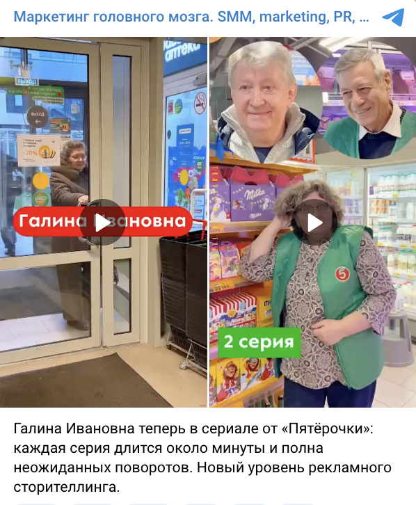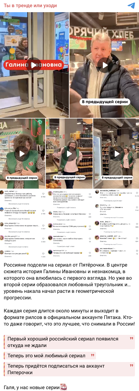 Сеть магазинов «Пятёрочка» выпустила вертикальный мини‑сериал о сотруднице Галине Ивановне, которая ищет «мужчину мечты» — постоянного покупателя Василия. Первый сезон включает пять серий, суммарно набравших более 3,5 млн просмотров. У истории счастливый конец, а зрители уже ждут продолжения.