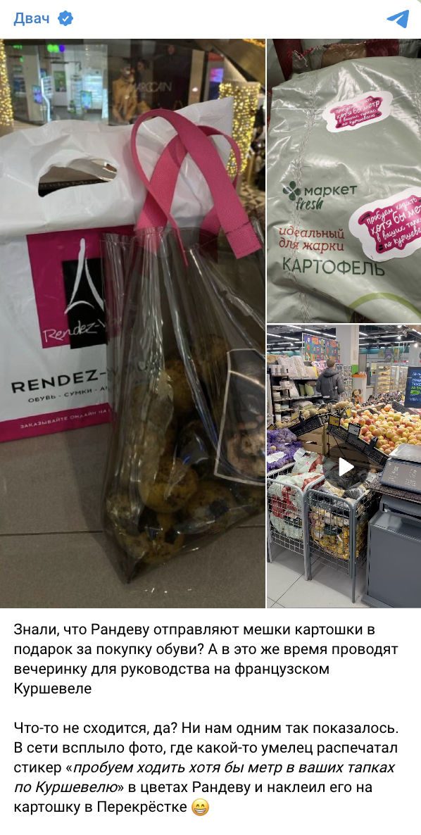 Однако демонстративная роскошь поездки вызвала волну критики в социальных сетях. Спустя некоторое время критики перешли от онлайн-обсуждений к офлайн-иронии: в одном из магазинов «Перекресток» на мешки картофеля наклеили логотип «Рандеву», представив это как «бонус» к покупке обуви и тем самым подчеркнув контраст между показной роскошью и повседневной реальностью.