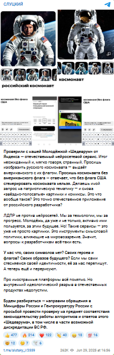 Одной из популярных новостей 2025 года о «Шедевруме» стало предложение председателя партии ЛДПР Леонида Слуцкого перенастроить алгоритмы нейросети для генерации изображений и видео.