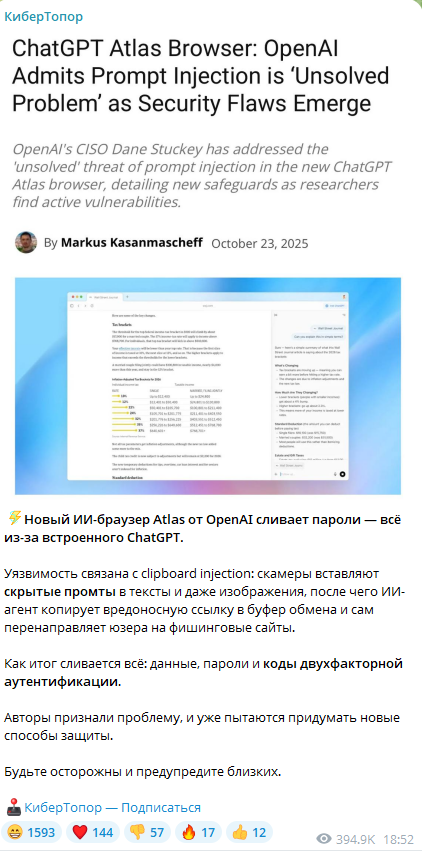 Ещё одной громкой новостью OpenAI стал запуск браузера Atlas со встроенными функциями ChatGPT. Пользователи Atlas могут сёрфить в сети с помощью нейропомощника, управлять памятью поиска с помощью ИИ и включить режим агента, делегировать ChatGPT определённые задания — скачать документ, оформить онлайн-заказ, ответить на сообщение в почте и т.д.