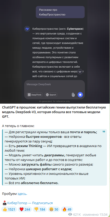 В начале 2025 года китайский разработчик ИИ DeepSeek выпустил новейшую языковую модель R1, которая за первые же выходные после релиза стала лидером американского рейтинга приложений AppStore.