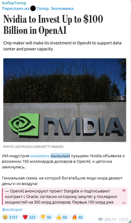 И вот почему: в сентябре китайская компания Nvidia объявила об инвестировании $100 млрд в OpenAI и навела экспертов на подозрения в коммерческом сговоре. Сперва контракт на эту же сумму OpenAI заключил с компанией Oracle (а Ларри Эллисон сместил Илона Маска с первого места в списке богатейших людей мира), затем Oracle закупила партию видеокарт на те же $100 млрд у Nvidia, чья капитализация после сделки побила рекорды. Что произошло потом, многих обескуражило: те же самые $100 млрд вернулись в OpenAI в виде инвестиций Nvidia.