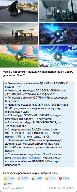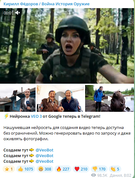 В конце июля пользователи Telegram активно писали о том, что функциями нейросетей veo3 стало можно пользоваться прямо в чате — оживлять фотографии, форматировать видеоролики, генерировать любой другой визуал.