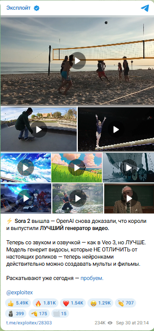Все видеоролики легко подгрузить в сторонние приложения. Дополнительно отмечается, что весь контент автоматически маркируется как «созданный ИИ», а также в Sora 2 действуют ограничения 18+.