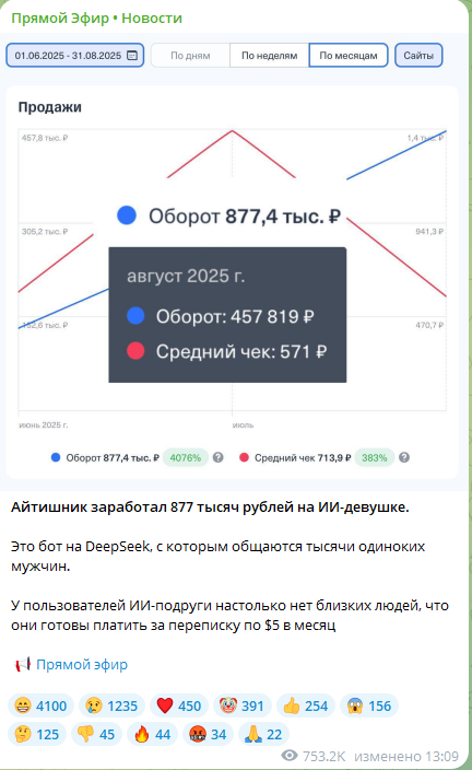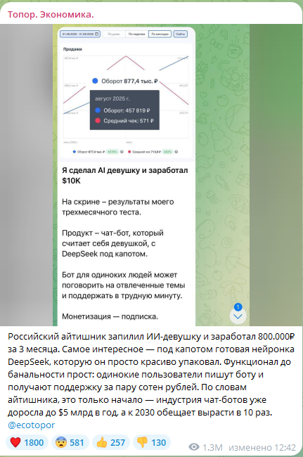 Бот работает на базе алгоритмов DeepSeek, доступ обходится в пару сотен рублей, им уже воспользовались тысячи одиноких мужчин, а разработчик за три месяца с запуска проекта заработал около 800 тыс. руб.