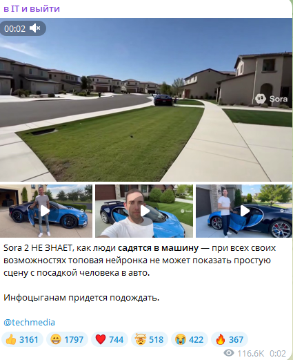 Во-первых, потому что ролики, созданные в Sora 2, часто лишены какого-либо смысла (фигуристка вращается с котом на голове и т.п.); во-вторых, сгенерированные в приложении видео выглядят, как настоящие, и могут ввести неосторожных пользователей в заблуждение; а в-третьих, Sora 2 иногда галлюцинирует и создаёт нечто нелепое — например, крайне странно усаживает водителя за руль авто.