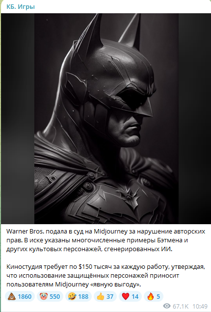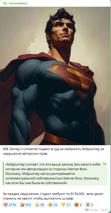 Впрочем, в начале сентября о приложении появились не самые комплиментарные новости: киноконцерны Disney, Universal и Warner Brothers вслед друг за другом подали иски на Midjourney за нарушение авторских прав, в частности, за массовую генерацию изображений популярных анимационных персонажей — Бэтмена, Супермена, Скуби-Ду, Дарта Вейдер, Барта Симпсон, Шрека, Ариэль из «Русалочки» и других героев.
