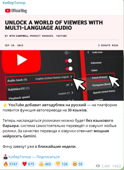 Заметным инфоповодом про нейросеть стал анонс запуска автодубляжа видео на русский язык платформой Youtube — за качество перевода и озвучки отвечает как раз Gemini.