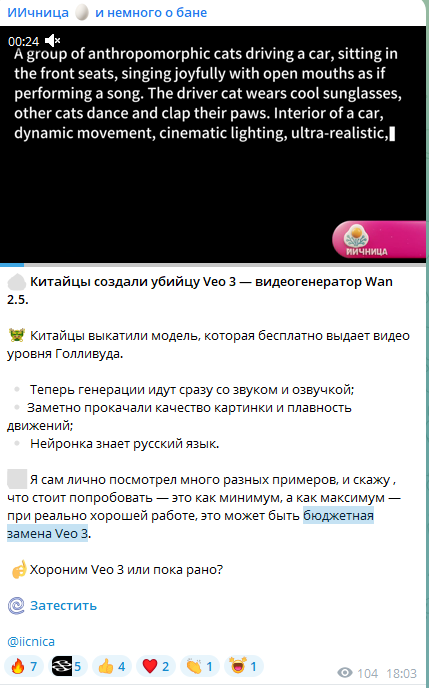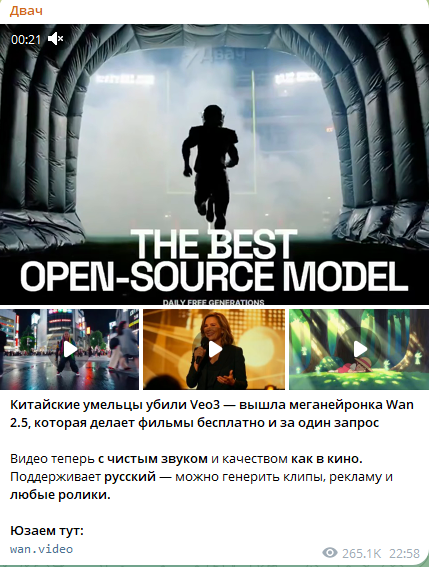 Однако позже внимание пользователей переключилось на другое приложение, которое, по их заверениям, «убило veo3» — на китайскую «меганейронку» Wan 2.5, которая, в отличие от veo3, работает не только эффективно, но и бесплатно (хотя есть и расширенные версии по подписке).