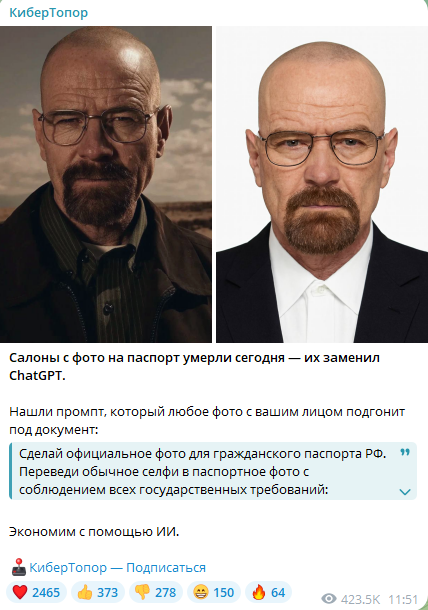 Об удобной возможности ChatGPT в соцсетях писали под победным заголовком «Салоны с фото на паспорт умерли». Однако о том, принимают ли сгенерированное изображение сотрудники МФЦ при оформлении документов, пока неизвестно.