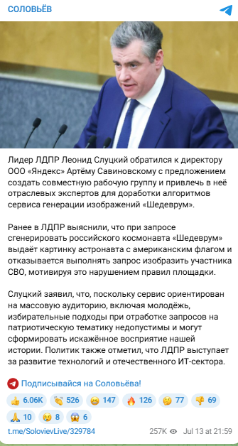 В июле Леонид Слуцкий сообщил, что направил директору ООО «Яндекс» Артёму Савиновскому предложение создать совместную рабочую группу для доработки приложения после того, как Шедеврум сгенерировал изображение российского космонавта с американским флагом, хотя запрос пользователя того не требовал. Ошибку при использовании приложения заметили члены Молодёжной организации ЛДПР.