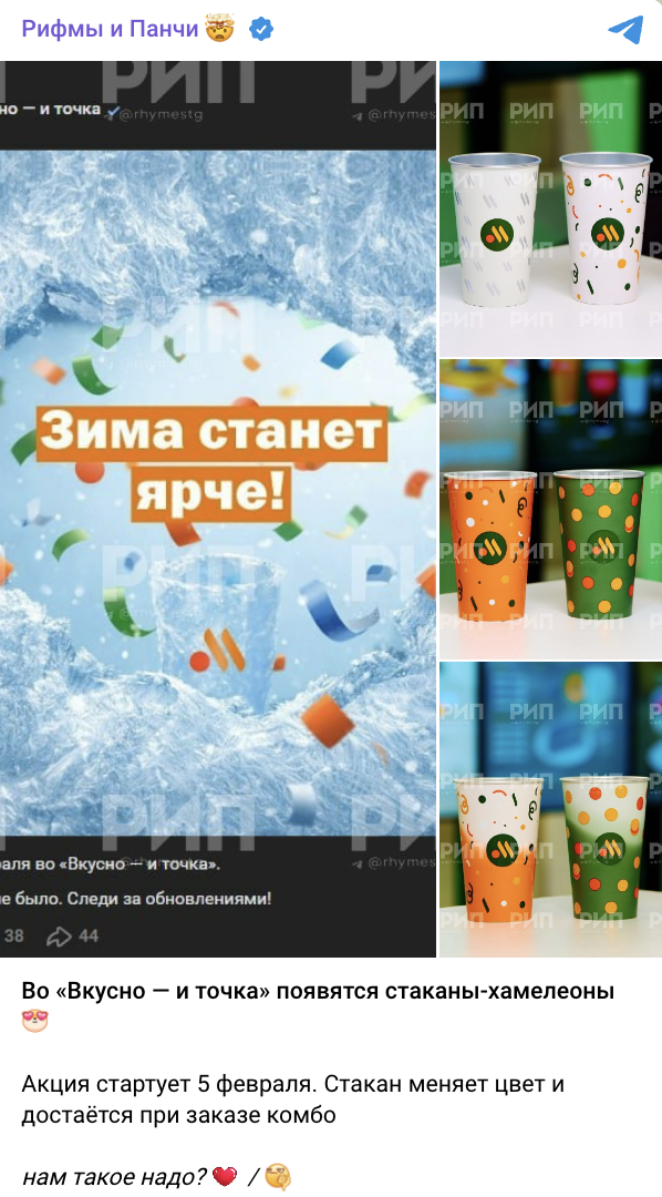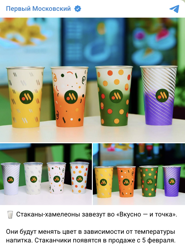 Сеть ресторанов быстрого питания «Вкусно — и точка» представила первую коллекцию стаканов-хамелеонов, меняющих цвет в зависимости от температуры напитка.