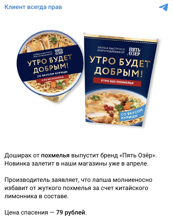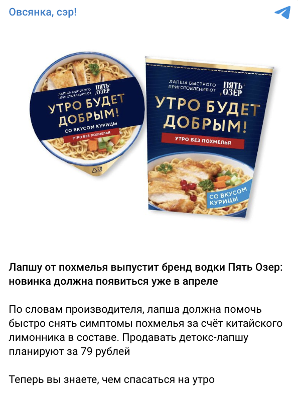 Бренд «Пять Озёр» планирует выпустить лапшу от похмелья. В январе компания подала заявку на регистрацию товарного знака «Утро будет добрым» для лапши, спагетти и других макаронных изделий. Первая «детокс-лапша» содержит добавку с китайским лимонником, который помогает бороться с похмельем. Ранее эта же добавка использовалась в «беспохмельной» водке «Пять Озёр», выпущенной в прошлом году. Линейку решили расширить именно лапшой, поскольку её считают самым популярным блюдом наутро после застолья.