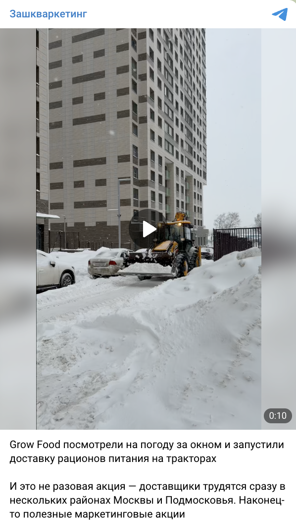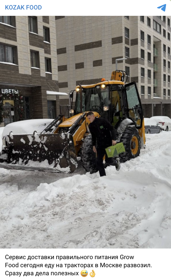 Сервис доставки правильного питания Grow Food в Москве начал доставку заказов на тракторах из-за ухудшения погодных условий. Помимо доставки продуктов пользователям, курьеры на тракторах помогали также с расчисткой снега. Для управления тракторами были привлечены специалисты с удостоверением тракториста‑машиниста, у которых в распоряжении небольшие лопаты и щетки для снега.