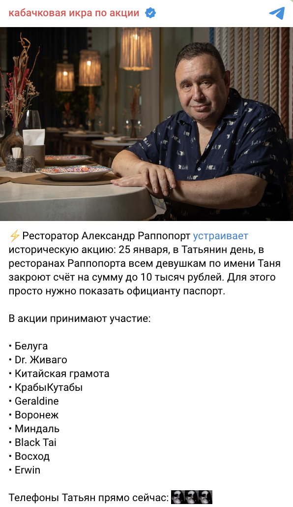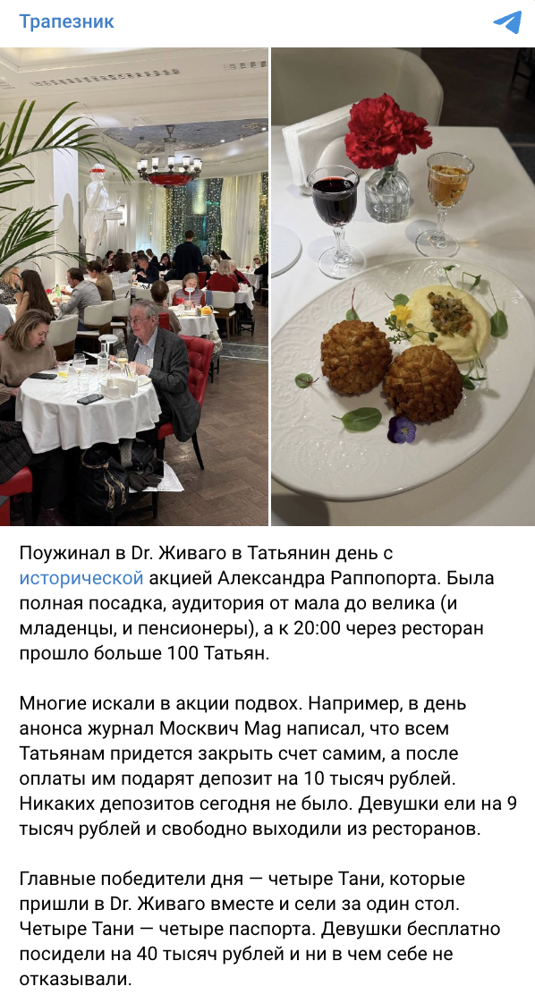 25 января ресторатор Александр Раппопорт провёл акцию в своих ресторанах «Белуга», Dr. Живаго, «Китайская грамота», «КрабыКутабы», Geraldine, «Воронеж», «Миндаль», Black Tai, «Восход» и Erwin. Всем девушкам по имени Татьяна закрывали счёт на сумму до 10 000 рублей. Для того чтобы поужинать, было достаточно показать официанту паспорт.