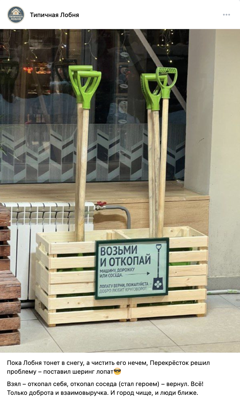 На фоне сильных снегопадов в Москве торговая сеть «Перекресток» запустила в ряде супермаркетов бесплатный прокат лопат для уборки снега. Главное условие – вернуть инструмент обратно в магазин после использования.. Сотрудники магазинов отмечали, что посетители положительно отзывались об инициативе.