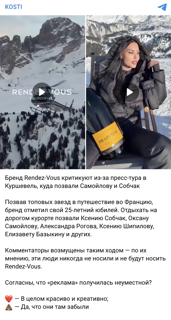 Бренд Rendez-Vous организовал пресс-тур в Куршевель, пригласив Ксению Собчак, Оксану Самойлову, Александра Рогова и других знаменитостей. Программа включала катание на снегоходах, вертолетные перелеты и закрытые мероприятия на фоне альпийских пейзажей, что подчеркнуло премиальный имидж компании.