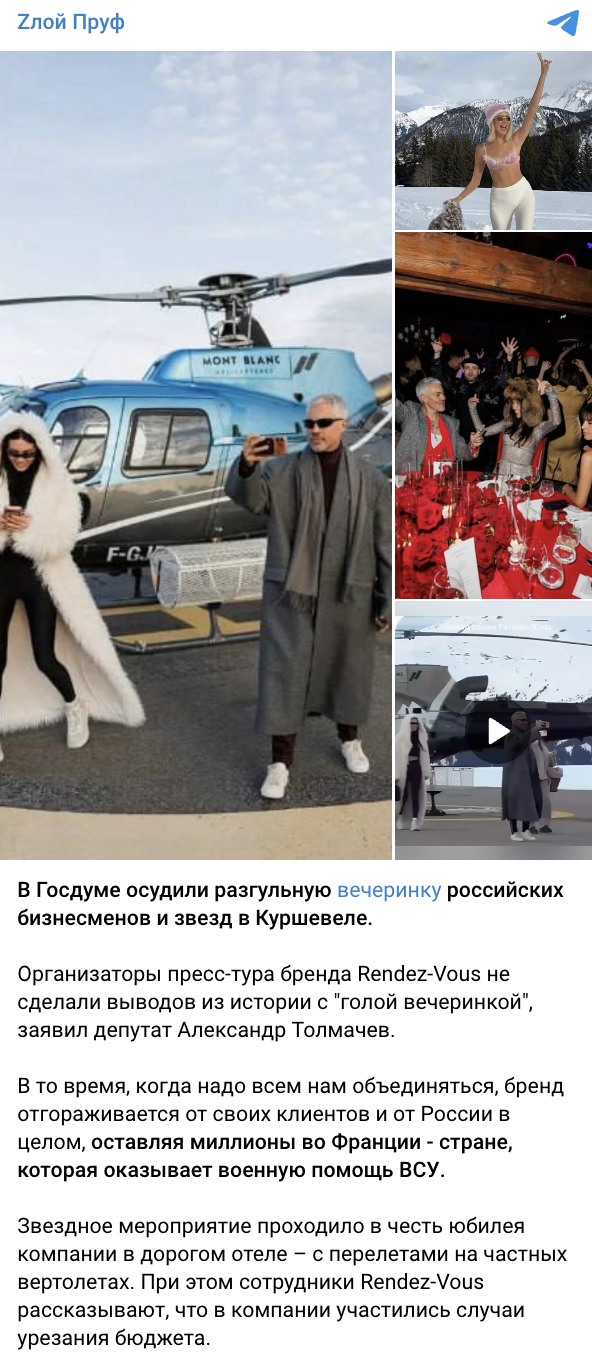 Также стоит отметить инфоповод, который вызвал широкий резонанс в соцсетях - пресс-тур бренда Rendez-Vous в Куршевель. Однако, несмотря на повышенный интерес к событию, тональность публикаций и комментариев оставалась преимущественно негативной.