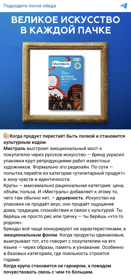 Бренд «Мистраль» запустил коллаборацию с Государственной Третьяковской галереей. На упаковках появились работы известных художников: Кандинского, Малевича и Кустодиева.
