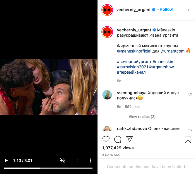 Группа Måneskin также успели посетить вечернее шоу Ивана Урганта и сделать ему свой фирменный макияж.