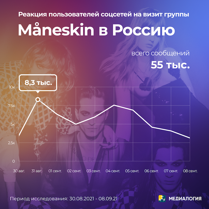 Используя систему Медиалогия, проанализировали реакцию пользователей соцсетей на приезд группы Måneskin в Москву. Всего в период с 30.08 по 8.09 было зарегистрировано более 55 тыс. сообщений на эту тему.