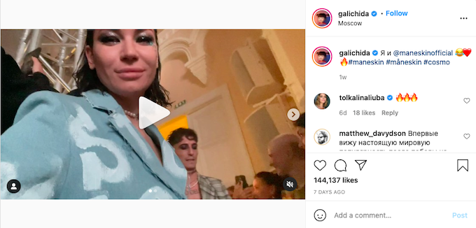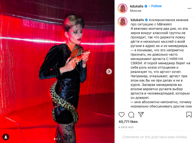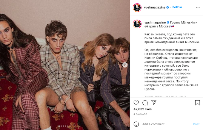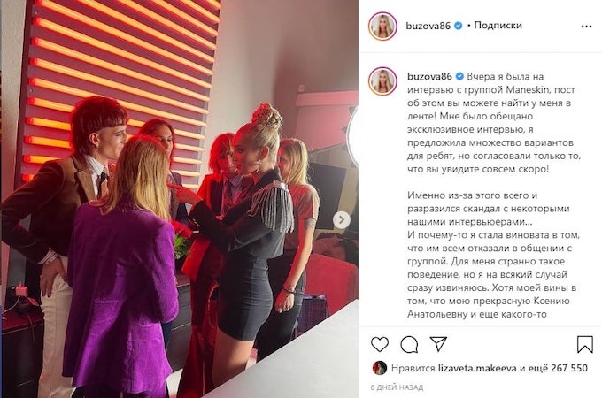 Российская журналистка Татьяна Мингалимова в своем посте в Instagram также сообщила, что музыканты в последний момент отказались давать ей интервью, нарушив тем самым договоренности. Тем не менее, Татьяне все же удалось пообщаться с Måneskin в рамках встречи, которую устроили Spotify Russia.