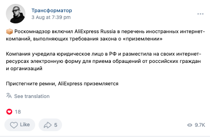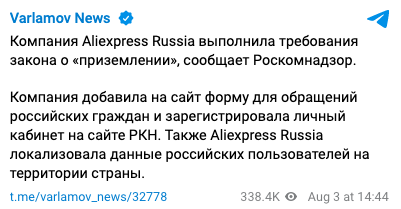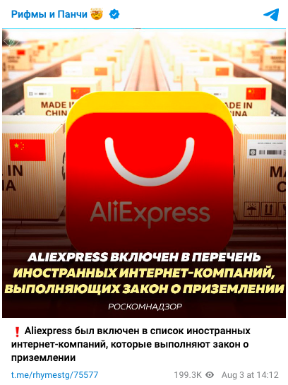 Третью позицию рейтинга занял Aliexpress Russia (1 млн сообщений). Пользователи соцсетей обсуждали новость о том, что компания, зарегистрированная в Сингапуре, выполнила все требования закона о "приземлении" в РФ иностранных IT-гигантов.