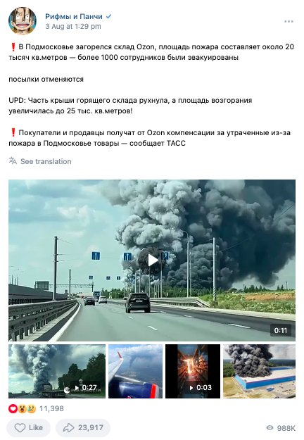 Чаще всего этим летом пользователи соцсетей обсуждали интернет-магазин Ozon (1,3 млн сообщений). Отчасти это было связано с пожаром, который произошел в августе на складе компании в районе г. Истра. В результате ущерб инцидента оценили в более чем 10 млрд рублей. Об этом в своих каналах писали известные блогеры и паблики.