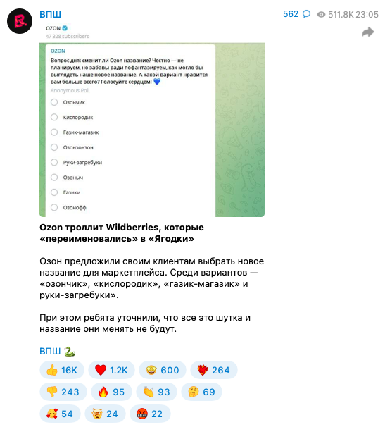 Ozon отреагировал на смену названия своего конкурента - маркетплейса Wildberries, который занял второе место в рейтинге (1,1 млн сообщений).