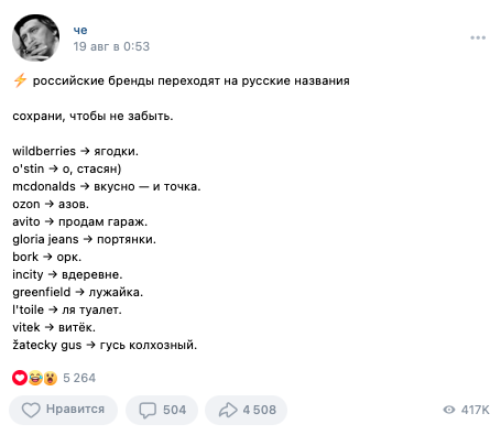 Дело в том, что в июне во время "Недели российского ритейла — 2022" основательница Wildberries Татьяна Бакальчук заявила, что компания подумает о русификации бренда, а 15 августа сайт получил название “Ягодки”. Однако уже на следующий день Wildberries вернул свое англоязычное название. Смену названия компания объяснила маркетинговой акцией. Другие компании и пользователи соцсетей также подхватили эту новость и начали активно шутить на эту тему.