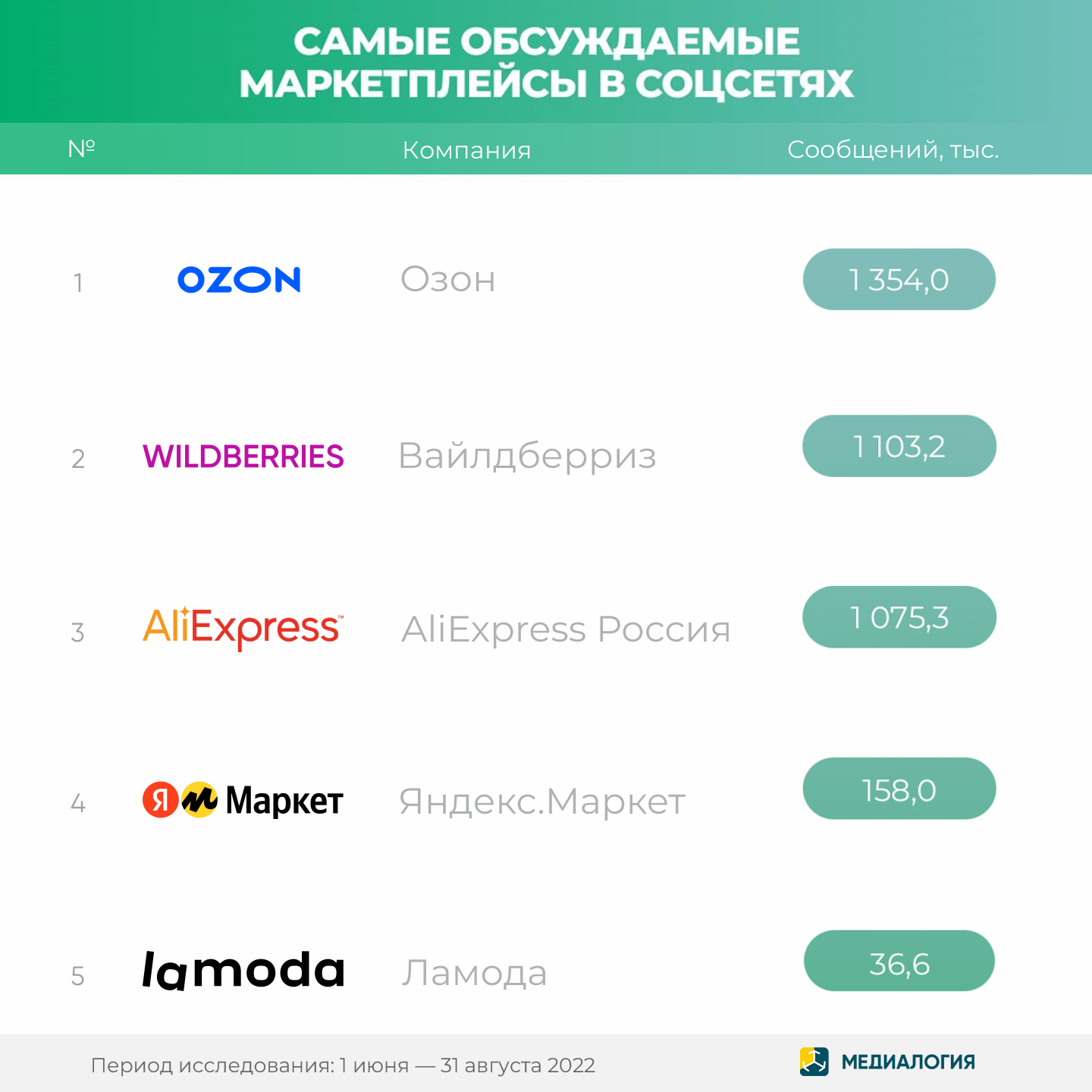 - Рейтинг построен по количеству упоминаний маркетплейсов в русскоязычном сегменте соцмедиа.