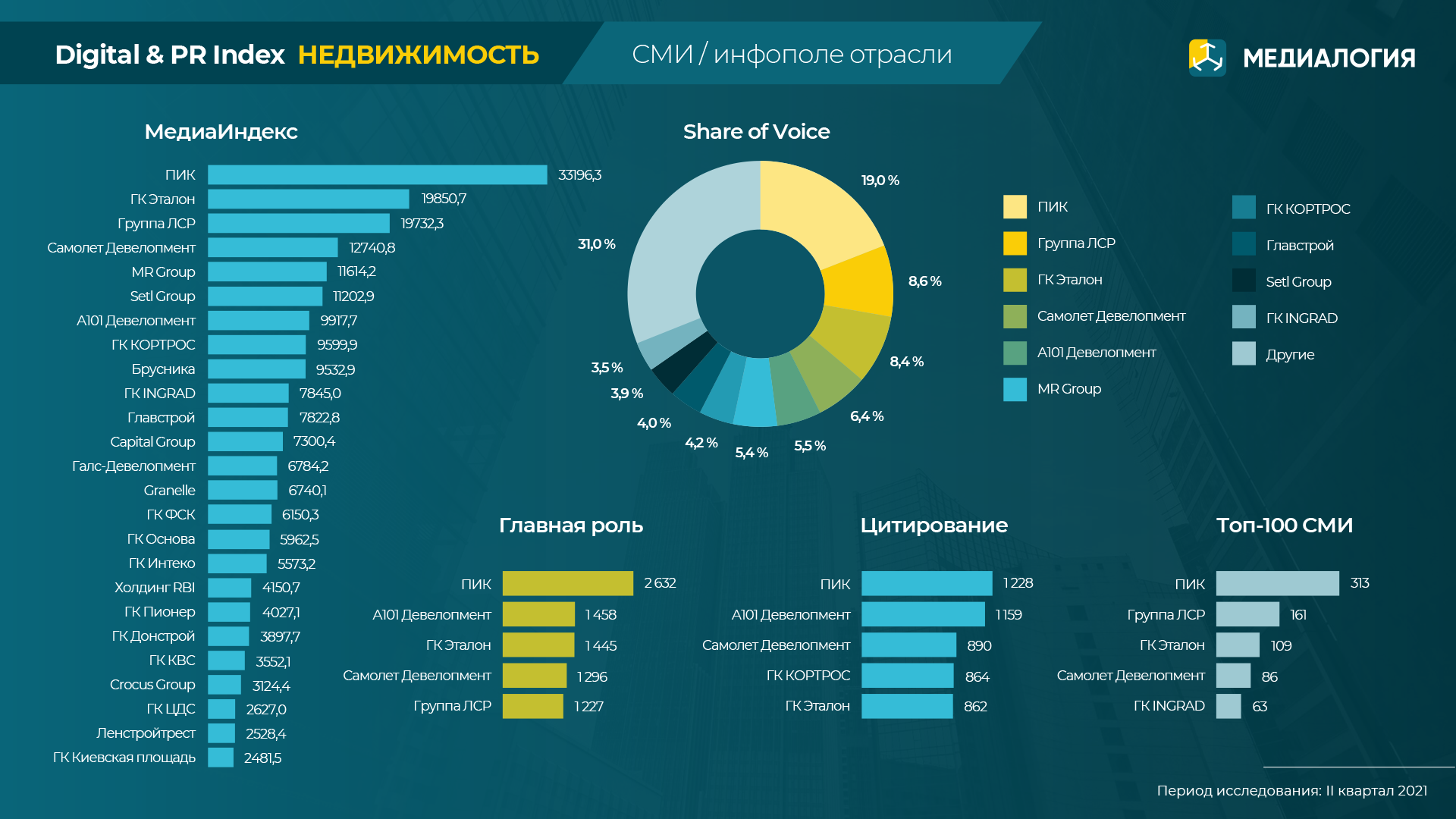 Лидерами рейтинга девелоперов в СМИ по качественному показателю МедиаИндекс во II квартале 2021 года стали ПИК, ГК Эталон, Группа ЛСР, Самолет Девелопмент и MR Group.